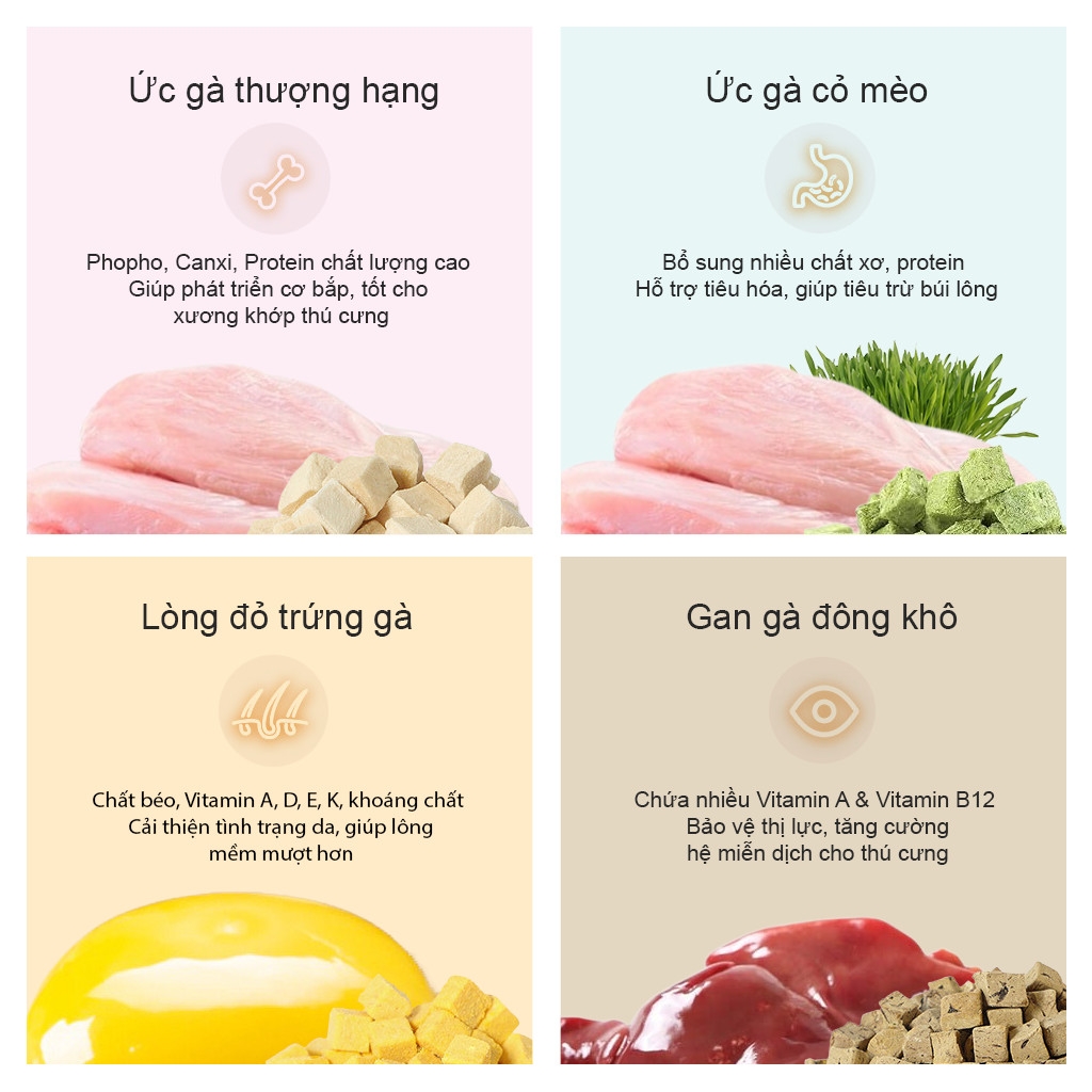 🌿Ức gà cỏ mèo: Chứa chất xơ tự nhiên hỗ trợ tiêu hóa và giảm hình thành lông rụng.